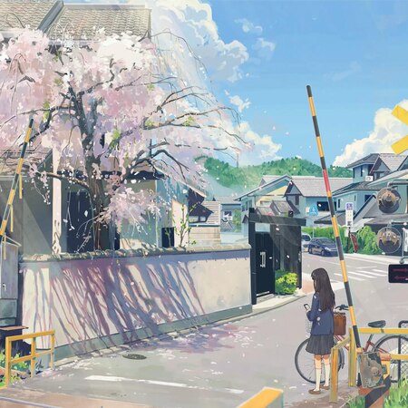 Relaxing Anime scene with falling cherry blossoms.