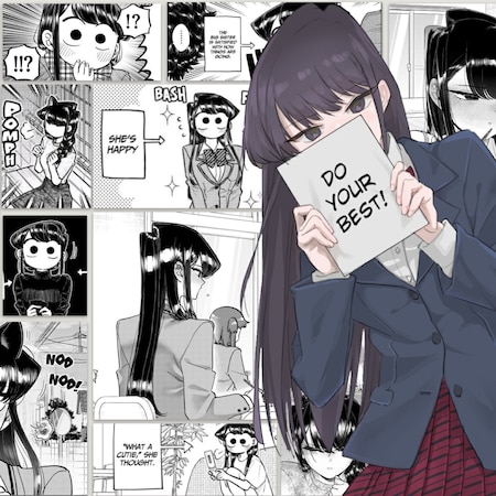 Komi Shouko from Komi-san Can't Communicate with manga panels in the background